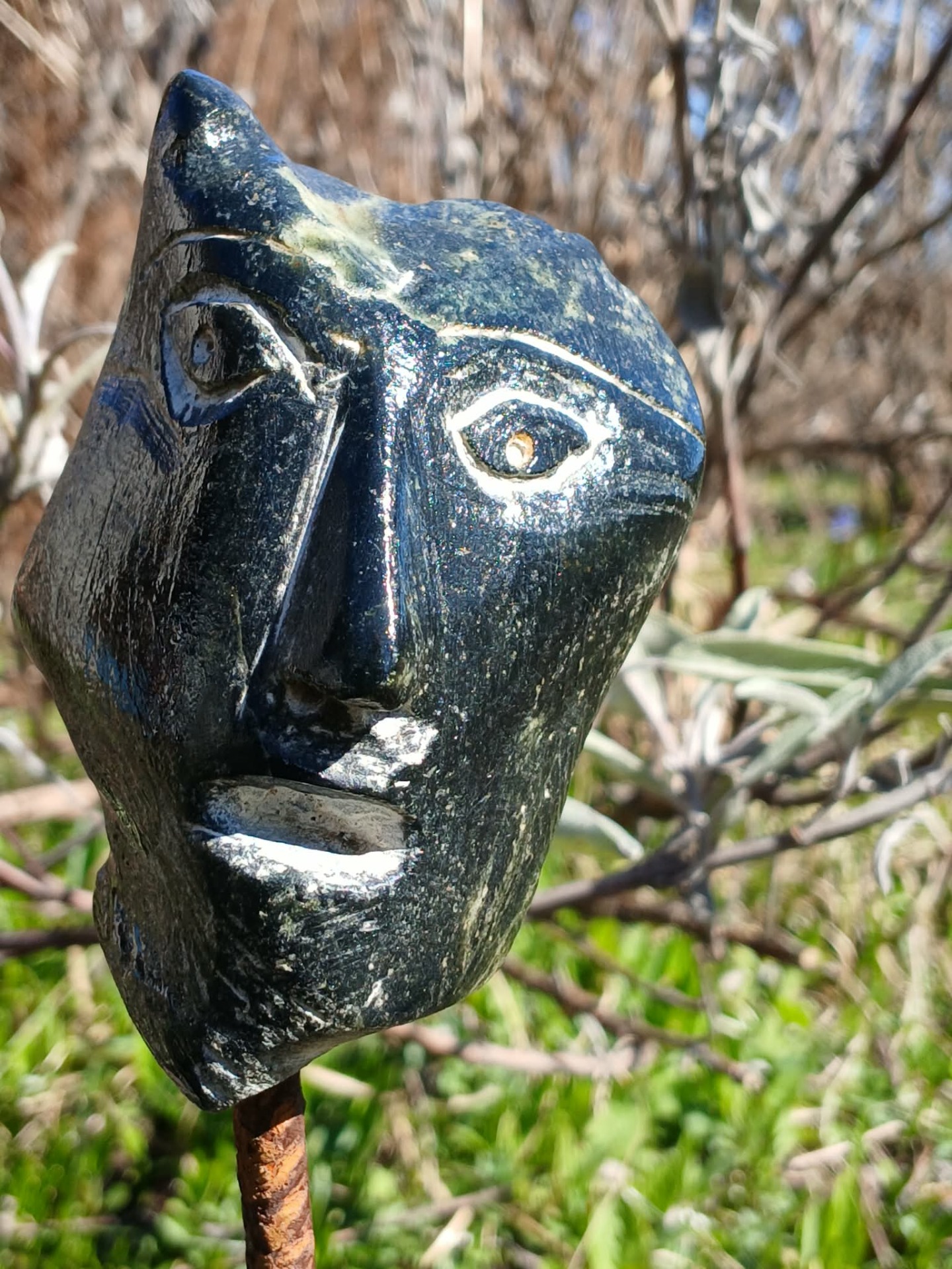 Klebersteinsfigur på jernstake. Kan stå ute, men bør takast inn før frosten kjem. Sjølve figuren er 6-8 cm høg, laga av Charlotte Hellum Wedel-Jarlsberg. Figuren er forma frå råstein. Charlotte bruker grove og fine rasper, små knivar og pussepapir, og avsluttar med olje, f.eks flytande bivoks. Ho veit aldri kva eller kven som "bur i steinen".